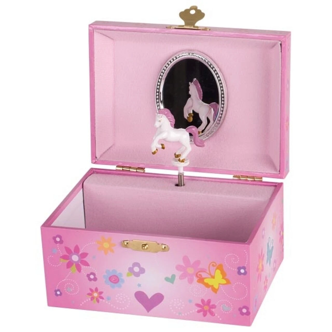 Eine Schatulle für die besonderen Schätze! Die Spieluhr lässt den „Schwanensee“ erklingen, das Einhorn dreht sich vor dem Spiegel – ein angemessener Auftritt für die wahren Kinderschätze.