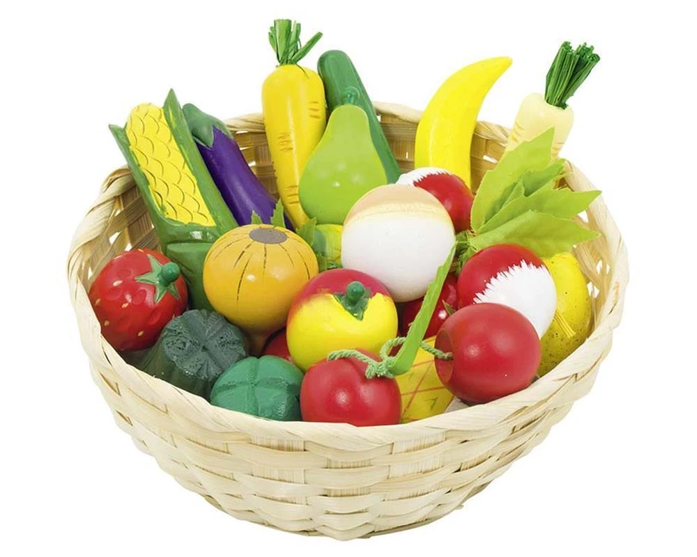 Ein Korb gefüllt mit Obst und Gemüse – die ideale Bestückung für den Marktstand (Art. 51808) oder den Kaufmannsladen (Art. RA201).