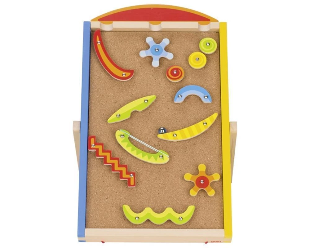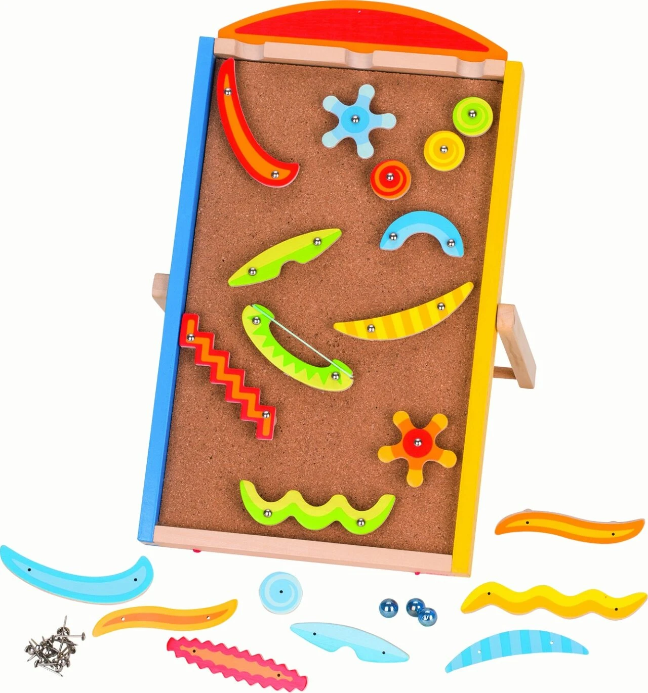 Die Murmelbahn zum unendlichen Umgestalten. Wir konnten kaum die Finger von diesem Kreativspielzeug lassen und sind davon überzeugt, dass es den Kids genauso gehen wird. Wie gelangt die Murmel an ihr vorgegebenes Ziel? Das Umstecken der farbenprächtigen Gestaltungselemente ist super einfach, denn die Stifte lassen sich ohne Mühe in die Korkplatte drücken.