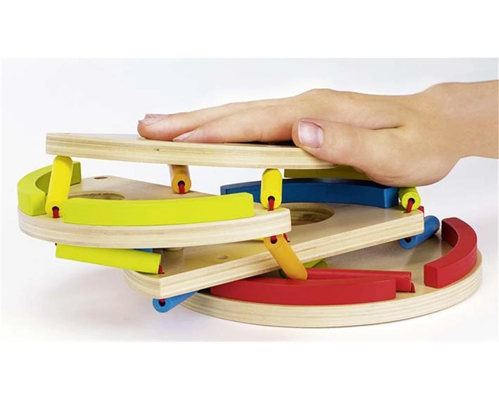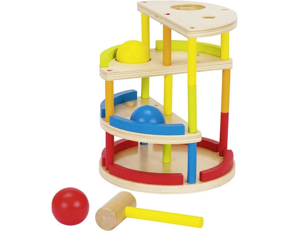 Klopf- Kugelbahn: Dreimal muss gehämmert werden ehe die erste Kugel im Ziel ist. Durch die Gummischnüre in den Verstrebungen ist das Klopfspiel flexibel und kann so bei Druckausübung von oben nicht zerbrechen.