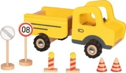 Ein Holzauto, gemacht für den täglichen Einsatz auf der Straße. Als robustes Baustellenfahrzeug, ausgerüstet mit dem notwendigen Zubehör für die kleinen Ausbesserungen des Straßenbelages. Die speziell für Kinderhände konzipierten, formschönen, offenen Seitenteile und eine hochwertige Gummibereifung erhöhen die Bespielbarkeit.