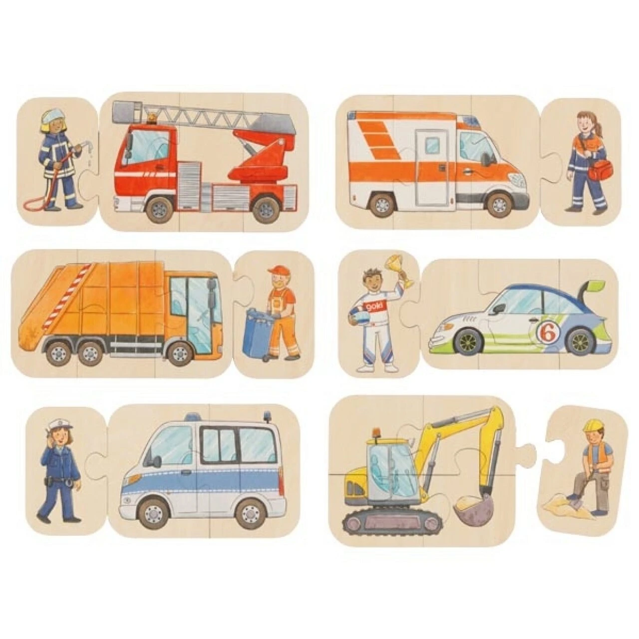 Holzpuzzle sind einfach ein Kindheitsklassiker: hier können Berufe den richtigen Fahrzeugen zugeordnet werden – gleichzeitig werden spielerisch Feinmotorik und das Erkennen von Formen gefördert.
