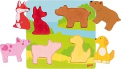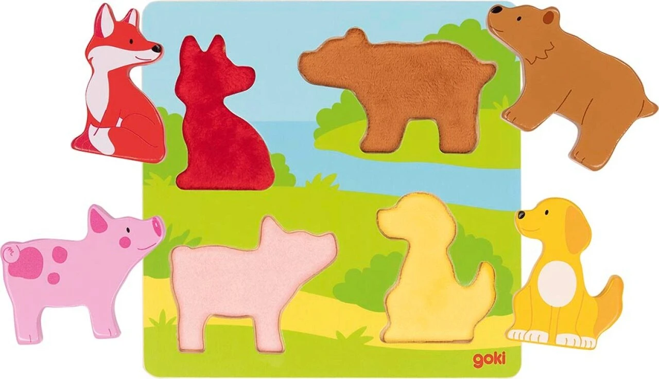 Puzzeln, fühlen, spielen – mit diesem goki Holzpuzzle geht das. Die Tierpuzzleteile sind aus dickem Holz, sodass sie tadellos stehen. Dem jeweiligen Tier wurde ein „Plüschfell“ auf den Boden des Puzzleausschnitts zugeordnet, das dem Echtfell möglichst nahe kommt. So geht Puzzlespaß von Anfang an.