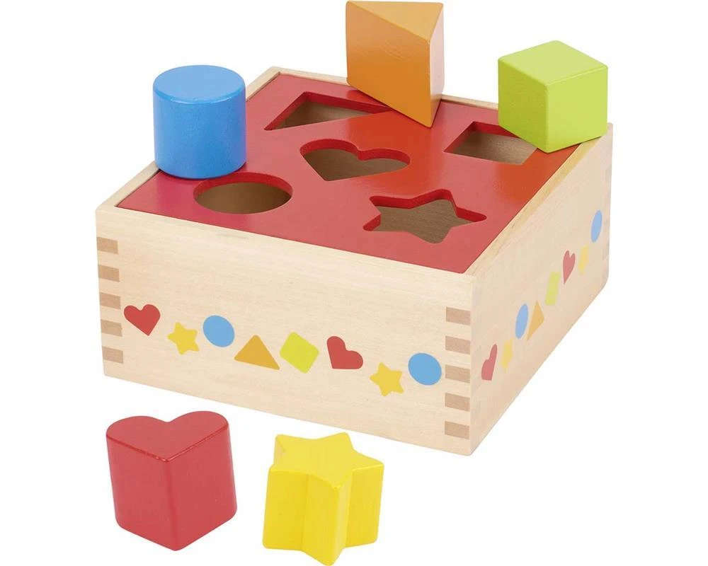 Ideal für das erste Zuordnen von verschiedenen Formen. Nur wenn du dich für das richtige Loch entscheidest, landet der Holzklotz im Inneren der Box.