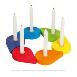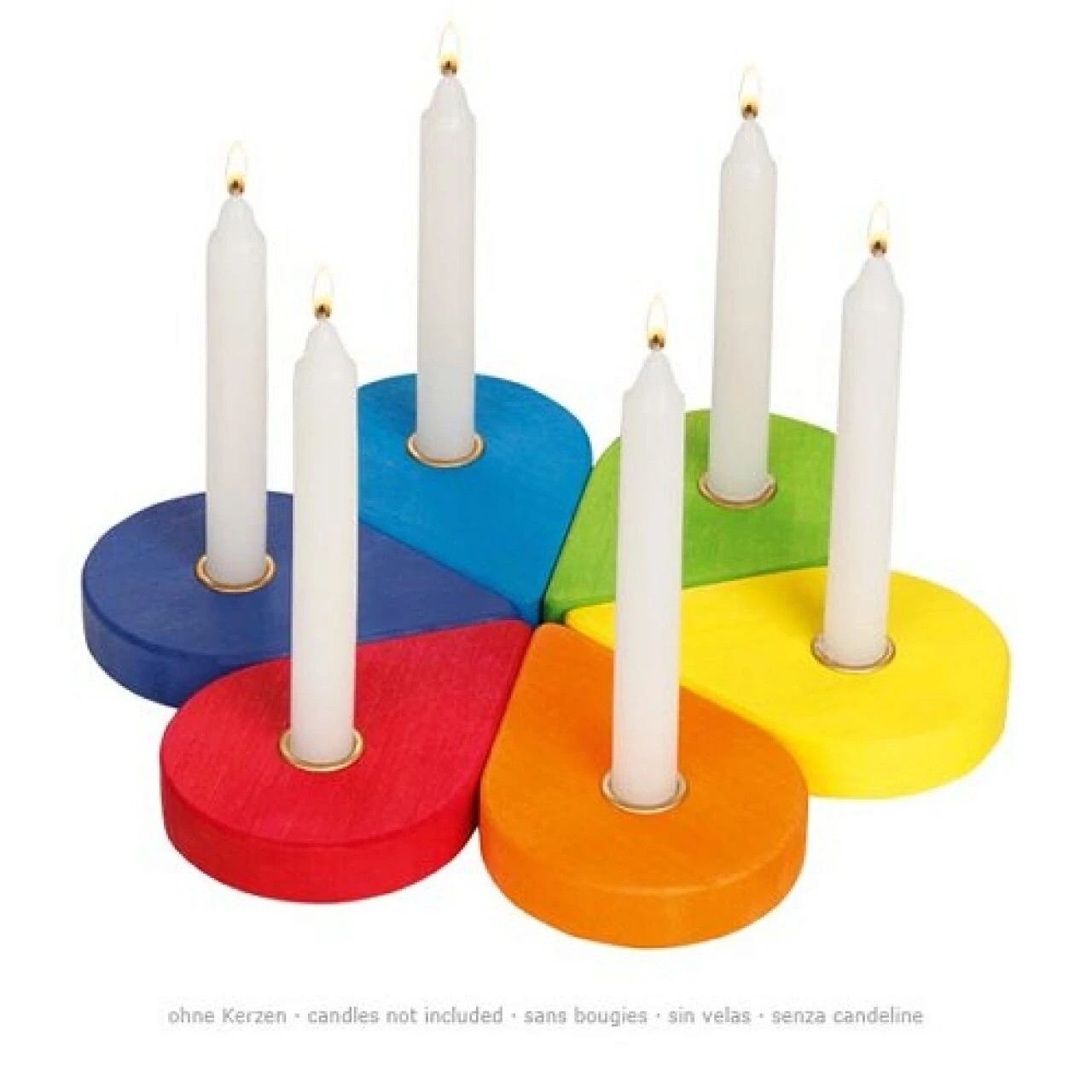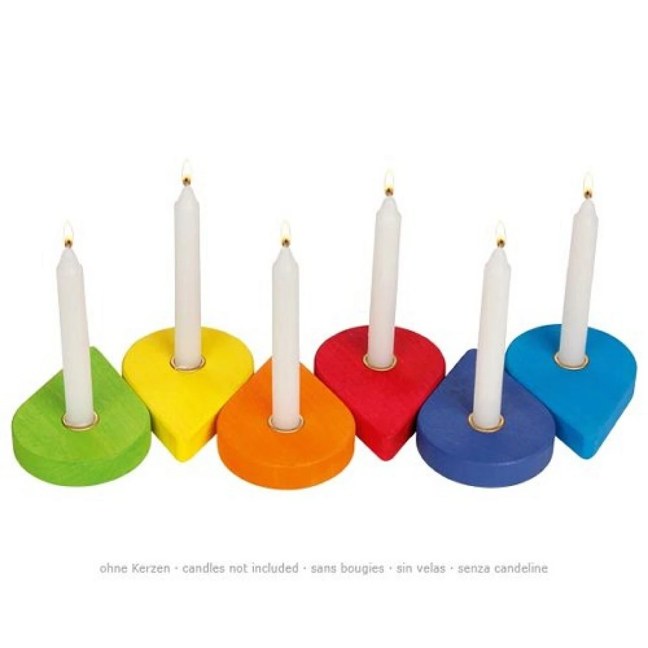 Geburtstagskranz einmal anders: die 6 Kerzenhalter aus Holz leuchten in den Farben des Regenbogens und können individuell und kreativ auf dem Geburtstagstisch angeordnet werden.