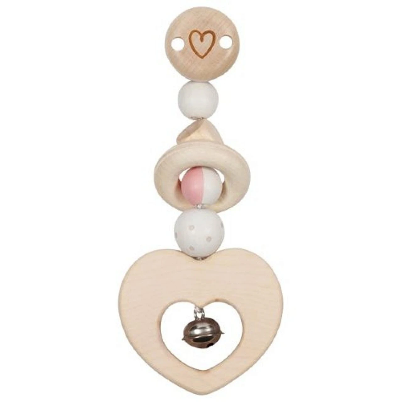 Die liebevoll gestaltete Clipfigur aus Holz mit Herz kann an Babybett, Kinderwagen oder Babyschale befestigt werden.