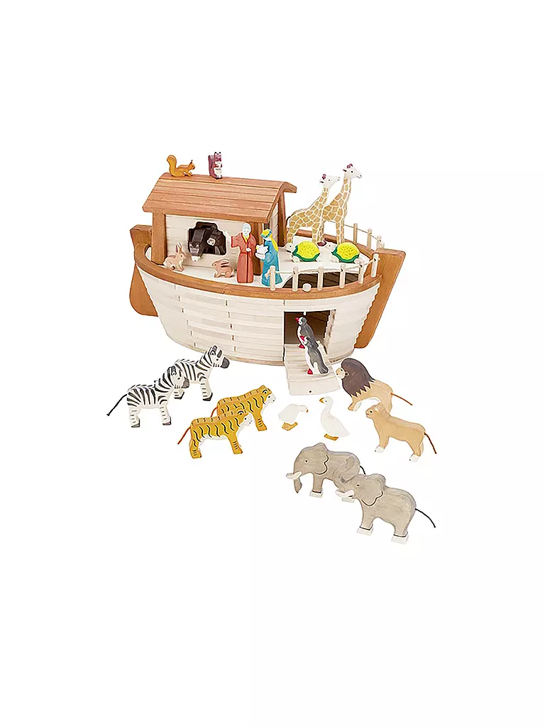 Luke auf für den Einzug auf die Arche. Das Abnehmen von Kajüte und Deck machen eine einfache Bespielung möglich. Sind alle Tiere an Bord setzt sich die Arche mittels eines Rollstabs in Bewegung. Ohne Dekoration!