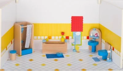 Das Badezimmer ist im Größenverhältnis passend zum Puppenhaus von Madera-Spielzeug.