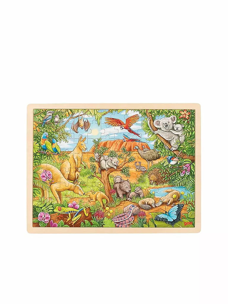 Es gibt wohl kaum eine skurrilere Tierwelt als die australische. Die bekanntesten Tiere sind auf diesem hochattraktiven 96teiligen Holzpuzzle äußerst liebevoll umgesetzt. Ein wahres Fest für alle Kinderaugen. Da kann das Puzzeln schon mal zur Nebensache werden.