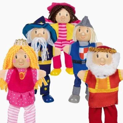 Mit denfünf Fingerpuppen lässt sich ganz wunderbar das Märchen erzählen.Fingerpuppen sind eine tolle Möglichkeit, Babys und Kleinkinder zu unterhalten. Für die größeren Kinder sind sie ein toller Einstieg in das darstellende Spiel, um eigene Geschichten zu erfinden und zu erzählen. Welche Abenteuer werden wohl erleben? Diefünf aus Stoff und Holzgestalteten Puppen sind circa 13 cm groß. Zum Set gehören dieser tapfere Ritter, Prinzessin, Zauberer, König, und die Fee