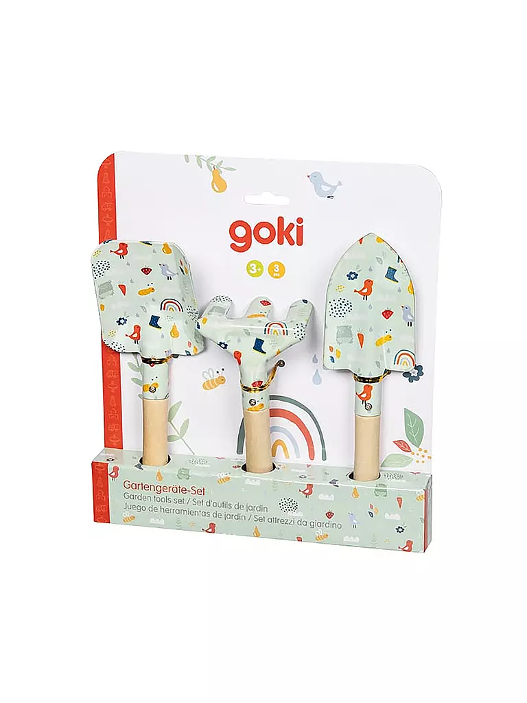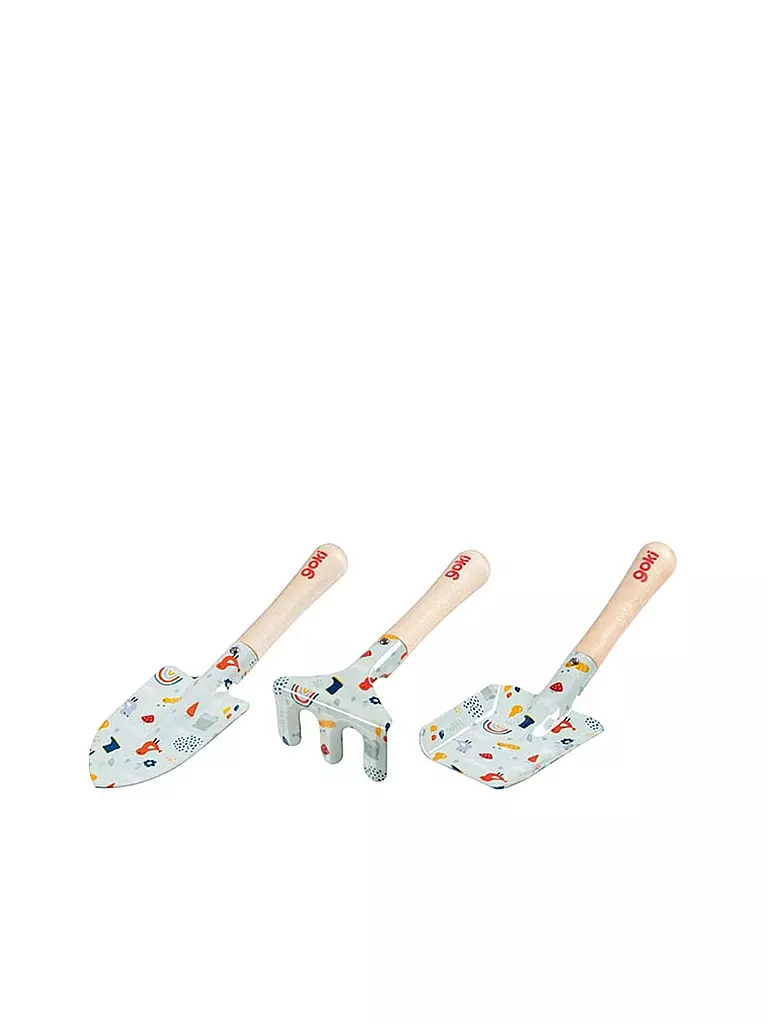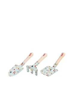 Dreiteiliges Gartenset für Kinder in liebevollem Design: wer mit zwei Schaufeln und einer Harke ausgestattet ist, kann in Frühling und Sommer auf dem Balkon oder im Garten fleißig helfen. Mit Holzgriff und ohne scharfe Kanten.