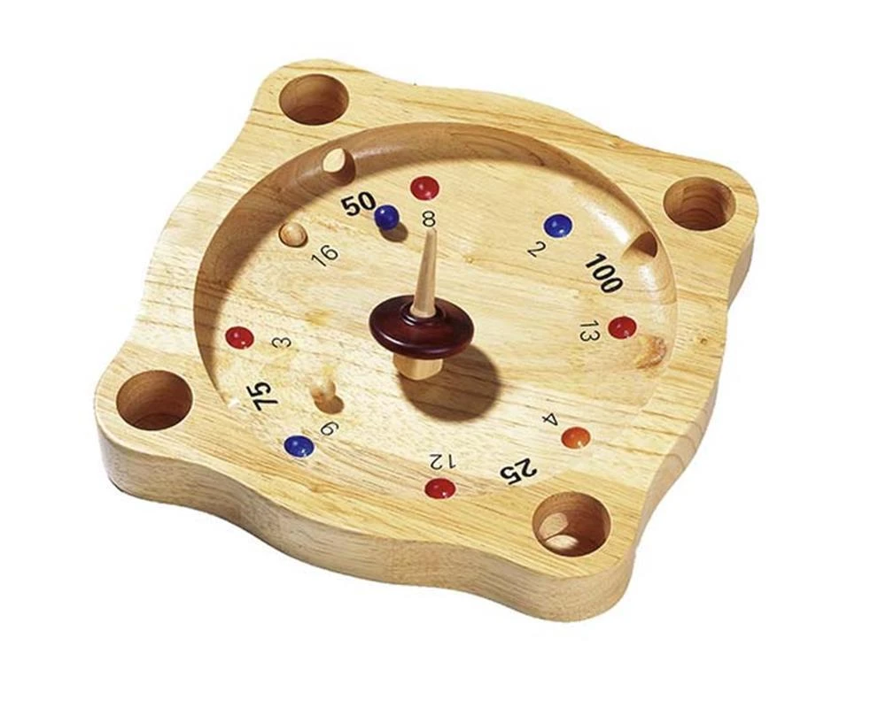 Ein Glücksspiel für die ganze Familie. 6 Kugeln werden in die Mitte des Spielfeldes gelegt und eine zu erreichende Punktzahl festgelegt. Nun wird der Kreisel zum drehen gebracht, der die Kugeln in die Löcher und Einkerbungen befördert. Gewonnen hat derjenige, der zuerst die ausgemachte Punktzahl erreicht hat.