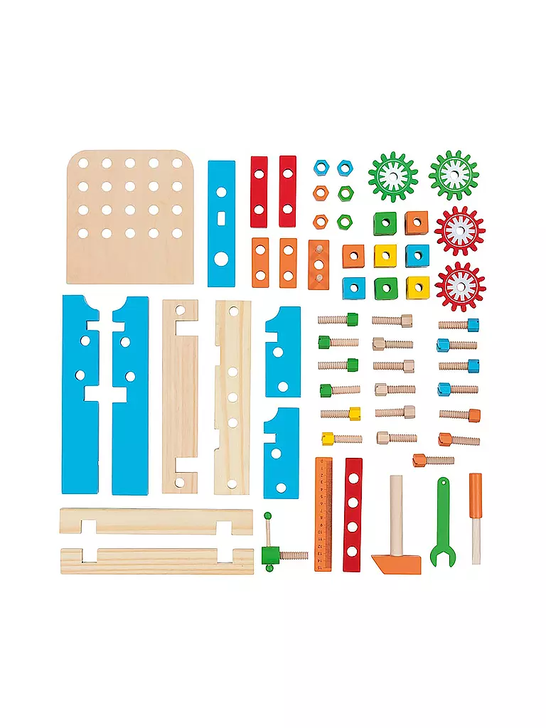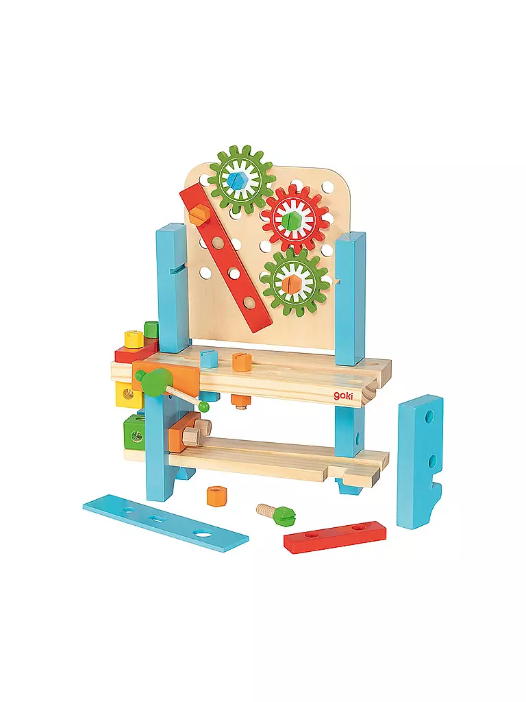 Diese Werkbank aus Holz ist bestens ausgestattet: mit Werkzeugen wie Hammer, Schraubenschlüssel und Schraubendreher können Formen zusammengesetzt und wieder auseinandergenommen werden, Werkstücke eingespannt und Teile vermessen werden. Ein Traum für jede kleine Handwerkerin und jeden kleinen Handwerker. Der Phantasie sind dabei keine Grenzen gesetzt und nebenbei werden spielerisch Farben und Formen erlernt. Wir sind gespannt auf eure Bauwerke!