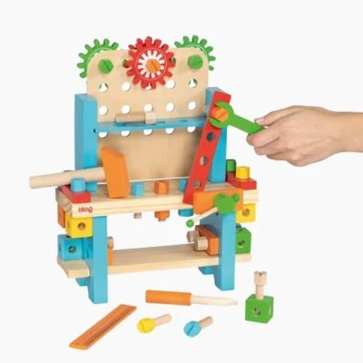 Heimwerker aufgepasst! Diese Werkbank aus Holz ist bestens ausgestattet: mit Werkzeugen wie Hammer, Schraubenschlüssel und Schraubendreher können Formen zusammengesetzt und wieder auseinandergenommen werden, Werkstücke eingespannt und Teile vermessen werden. Ein Traum für jede kleine Handwerkerin und jeden kleinen Handwerker. Der Phantasie sind dabei keine Grenzen gesetzt und nebenbei werden spielerisch Farben und Formen erlernt. Wir sind gespannt auf eure Bauwerke! Kinder können dabei ganz spielerisch ihre Eltern beim Handwerken unterstützen; das fördert ihre Kreativität und den Umgang mit Werkzeug. Welche Schraube soll jetzt festgezogen werden?