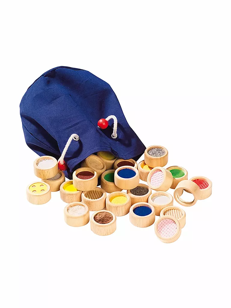 Ein ganz besonderes Memo-Spiel mit 32 Holzzylindern, in die 16 verschiedene Oberflächen eingelassen sind. Die sind mal sehr glatt, mal grob geriffelt, mal fein strukturiert und müssen nur durch Befühlen abgetastet werden. Sie befinden sich in einem blauen, blickdichten Leinensack. Versuche einmal, zwei identische Oberflächen zu ertasten. Das ist viel schwieriger als Du glaubst! Aber nur zwei völlig gleiche Oberflächen bilden ein Memo-Paar. Viel Spaß ist garantiert und der Tastsinn und die Haptik werden geschult.