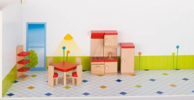 Die Küche ist im Größenverhältnis passend zum Puppenhaus von Madera-Spielzeug.