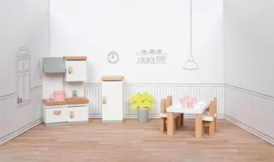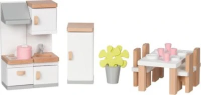 Mit diesem tollen Puppenmöbelset aus der „Style“-Kollektion von goki können Kinder ihr Puppenhaus besonders hübsch einrichten! In dem Set sind eine Küchenzeile mit Herd, Schränken und Dunstabzugshaube, ein Kühlschrank, ein Tisch mit Stühlen, eine Pflanze und weiteres Zubehör enthalten, sodass die Küche im Nu optimal ausgestattet ist. So haben Kinder noch mehr Freude an ihrem Puppenhäuschen!