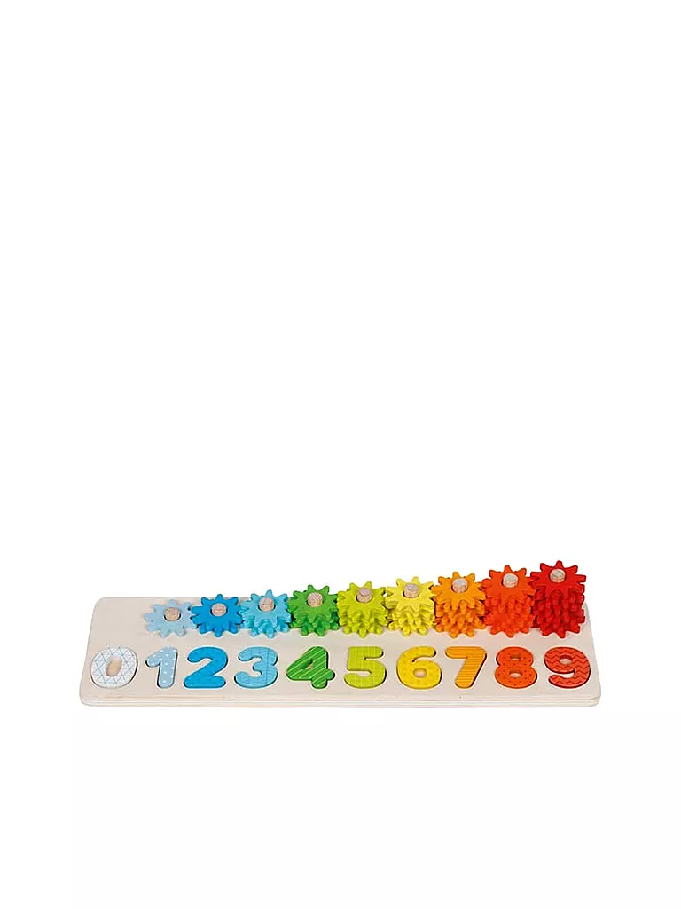 Sortierspiel mit Zahlen und Zahnrädern in Regenbogenfarben. So werden neben dem Zählen auch noch Farben gelernt und die Auge-Hand-Koordination und Feinmotorik gefördert.