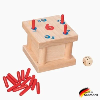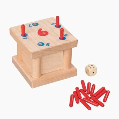 Ein spannendes Würfelspiel, bei dem sowohl Strategie als auch Glück gefordert sind. Dieser Spiele-Klassiker aus Holz eignet sich für zwei bis sechs Mitspieler und kann in zwei Varianten gespielt werden. Ziel ist es, als erstes alle Stäbchen loszuwerden. Dies gelingt, indem die Stäbchen reihum entsprechend der jeweils gewürfelten Augenzahl in die Box gesteckt werden.