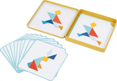 Das goki Tangram schlägt zusammengesetzte geometrische Figuren mit bestimmten Mustern vor. Die Kinder können dann nach Vorgabe mit den magnetischen Teilen die Figuren nachlegen. Dabei können die Teile direkt in die Metalldose des Spiels gelegt werden. So vermittelt Tangram Kindern ein erstes Verständnis für räumliches Denken und geometrische Formen. Natürlich können auch ganz freie Muster gelegt werden. Ein langanhaltendes und abwechslungsreiches Spielvergnügen!