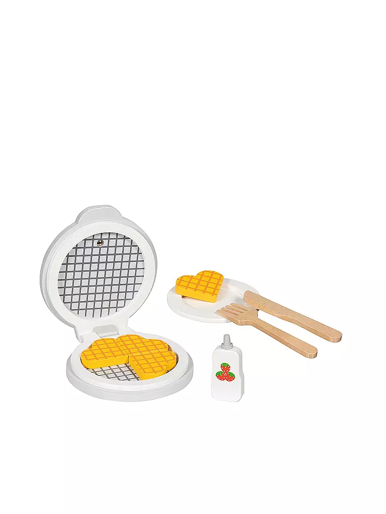 Zu einem richtigen Rollenspiel in der Küche gehört auch ein aufklappbares Waffeleisen. Alle Teile bestehen aus Holz und bilden doch realistisch Zubehör und Waffeln ab. Da wird es dem Teddybären oder den Puppen gleich nochmal so gut schmecken.