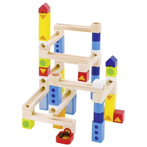 Der Bau einer Murmelbahn verbindet viele verschiedene Spielideen. Man baut quasi mit Bauklötzen, erschafft ein dreidimensionales Bauwerk und lernt nebenbei viel über Schwerpunkte und Schwerkraft. Denn nur wenn man logisch baut, kann die Murmel ihren Weg nach unten finden.