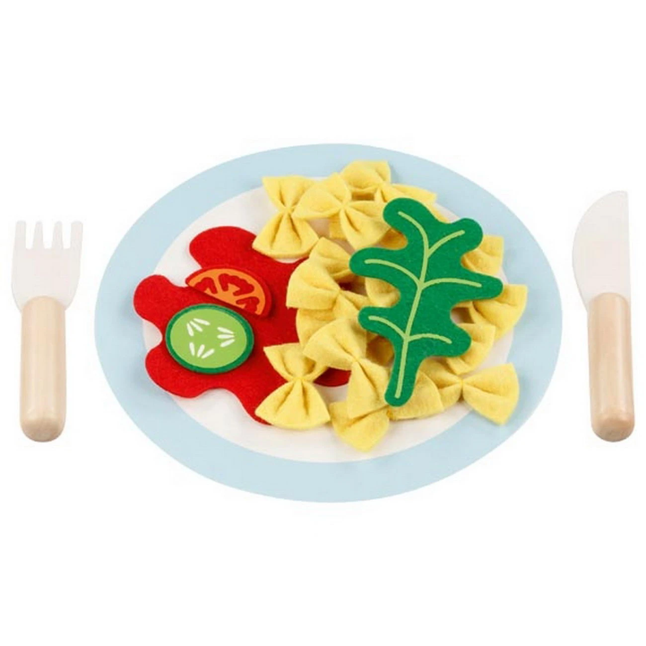 Aus Holz und Filz: Teller, Besteck, Nudeln und alles was dazugehört: Tomate, Gurke, Tomatensosse und Rucola. Für offenes Spiel und Rollenspiele. Vielleicht als Bistro-Angebot im Kaufmannsladen?